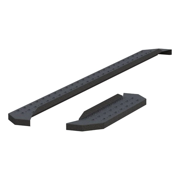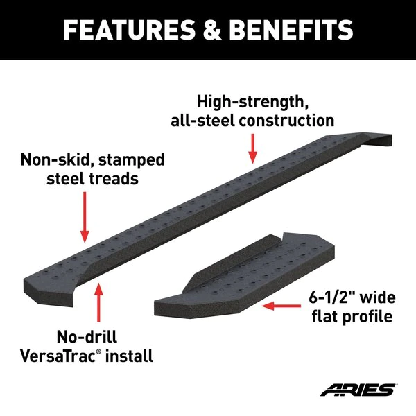 Powerful, definitive and uncompromising as a mountain ridge, ARIES RidgeStep running boards are made for those who gets it done, day after day. With their solid, all-steel construction, non-skid treads and tough powder coat finish, RidgeStep running boards are made to finish the job. Installation of these running boards is easy and secure because they use the ARIES VersaTrac mounting system. The underside of each board is equipped with a channel that accepts a set of heavy-duty bracket inserts. The inserts move along the channel to fit your vehicle, and the mounting hardware provides a secure attachment. The boards are made in four base lengths, including 53", 75", 85" and 91", and they are designed for vehicle-specific application (NOTE: VersaTrac mounting brackets are sold separately; see the application information to determine which brackets and boards fit your vehicle). ARIES RidgeStep running boards are not only made for easier installation, but they are also built to face the harsh elements of the commercial job. They feature high-strength, solid steel construction for a step that can keep up with those steel-toe boots, and they are completely without plastic parts, meaning they will not crack or fade over time. Their stamped, all-steel tread offers a 6-1/2" wide, non-skid surface that will never wear down no matter how many times you climb in and out of your vehicle. The end caps are also made from steel and are welded to contour to the body of your vehicle for a professional finish. RidgeStep running boards come with a unique E-coat and textured black powder coat finish to not only withstand rust but also to hide minor scratches and grime.