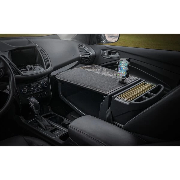 The Efficiency GripMaster car desk is a great desk for people who need basic storage in their vehicles. This model is equipped with a built-in power inverter to power all your mobile devices while you work. The X-Grip phone mount design accommodates most smartphones easily. The X-Grip design expands and contracts allowing for a secure fit for your phone. The top surface of this desk is covered with the rubber Non-skid material; this ensures that a laptop, briefcase, PDA, or cell phone will keep from sliding while the vehicle is in motion. This has a large storage area underneath the work surface and is great for office tools, computer accessories and laptops out-of-sight. Additional back storage compartments hold small supplies such as pens, maps, etc. This desk model is ideal for those needing to keep mobile equipment accessible during the day as well as needing a convenient area for working on a laptop.