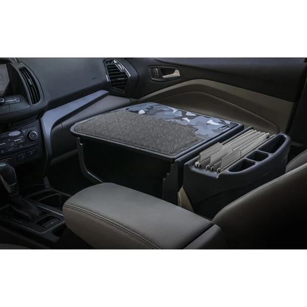 Even with all the technology available, paper files, and traditional writing is still a necessary evil. Our Grip Master car desk is ideal for this type of work. The top surface of this desk is covered with a rubber non-skid material; this ensures that a laptop, briefcase, or cell phone will keep from sliding while the vehicle is in motion. This Grip Master features a pull-out writing surface with built-in clipboard, which provides a convenient area for doing paperwork and writing. The large storage area underneath is great for office tools and accessories and also for keeping a laptop out of sight. Additional storage compartments hold small supplies such as pens, maps, etc. This desk model is ideal for those needing to keep mobile equipment accessible during the day as well as needing a convenient area for writing.