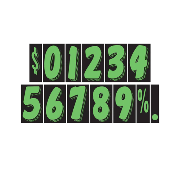 True Green & Black, 3-D shaded design, adhesive windshield number. An inexpensive yet highly effective sales tool to advertise a year model or price. Sold by the dozen {12 per pack}. Size: 7 1/2" tall x 4" wide. Neatly shrink wrapped in packs of a dozen with a chipboard backer to prevent curling during storage. Made of durable, waterproof vinyl, these non-fade numbers demand attention! Each number is slit on the back for easy application. Removable adhesive allows easy, clean removal. Please note these adhesive numbers are not reusable.Try our Starter Kit. See 143