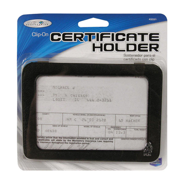 The clip-on certificate holder keeps your important vehicle documents within arms reach. The organizer clips onto your vehicle's visor. Great for truck drivers and delivery drivers who need to display their licenses.