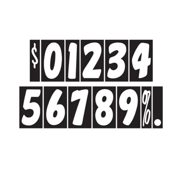 White & Black adhesive windshield number. An inexpensive yet highly effective sales tool to advertise a year model or price. Sold by the dozen {12 per pack}. Size: 7 1/2" tall x 3 3/4" wide. Neatly shrink wrapped in packs of a dozen with a chipboard backer to prevent curling during storage. Made of durable, waterproof vinyl and these non-fade inks. Each number is slit on the back for easy application. Removable adhesive allows easy, clean removal. Please note these adhesive numbers are not reusable. Not sure what to get? Try our Starter Kit. See 213