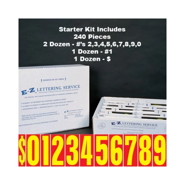 First time ordering or don't know what you want, try our convenient starter kit. This kit contains 20 dozen Yellow on Red (212) 9 1/2" tall adhesive windshield numbers and includes a free handy storage box (with easily removed perforated top). The 20 dozen consist of the following: two doz. of #2, #3, #4, #5, #6, #7, #8, #9, #0 and one doz. of #1, #$. These numbers are an inexpensive yet highly effective sales tool to advertise a year model or price. Size: 9 1/2" tall x 4 3/4" wide. Neatly shrink wrapped in packs of a dozen {12 decals} with a chipboard backer to prevent curling during storage. Made of durable, waterproof vinyl, these bright numbers demand attention! Each number is slit on the back for easy application. Removable adhesive allows easy, clean removal. Please note these adhesive numbers are not reusable.